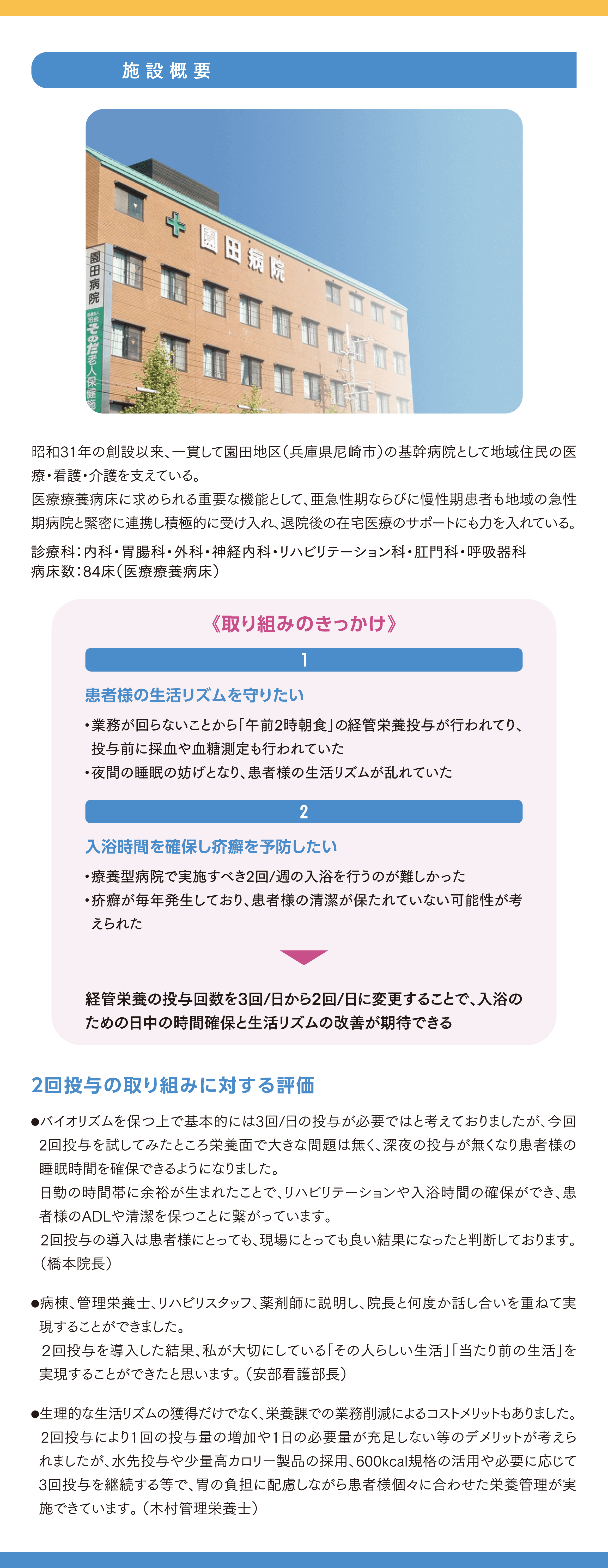 慢性期病院の課題解決流動⾷ 2回投与の取り組み - 2026-01-28 経管栄養の投与回数を3回/日から2回/日に変更することで、入力のための日中の時間確保と生活リズムの改善が期待できる。 新規登録またはログインするとコンテンツをすべて見ることができます ログイン 新規会員登録 Tags 低栄養・食欲低下 感染対策・衛生管理 リハ栄養 PHGG(グアーガム分解物) ペプチド ホエイプロテイン プレバイオティクス 業務改善