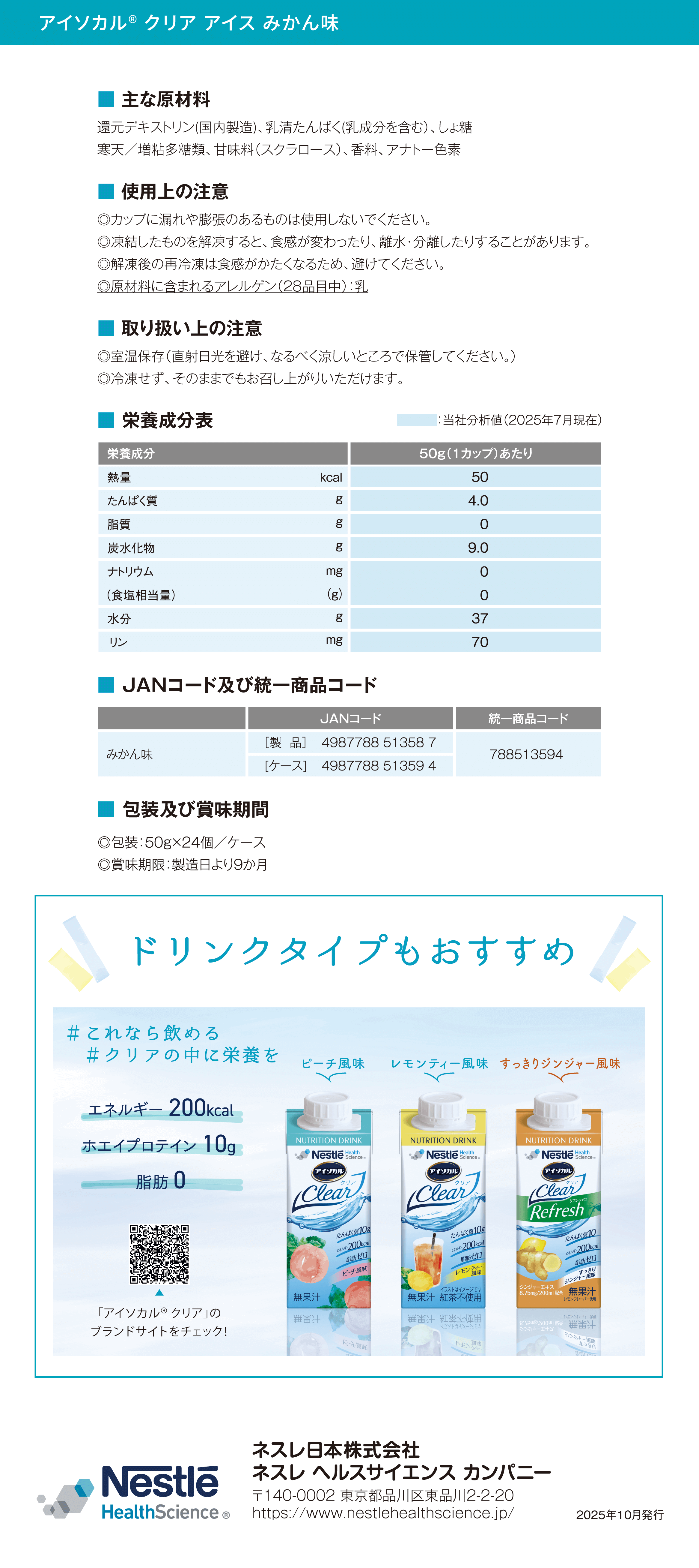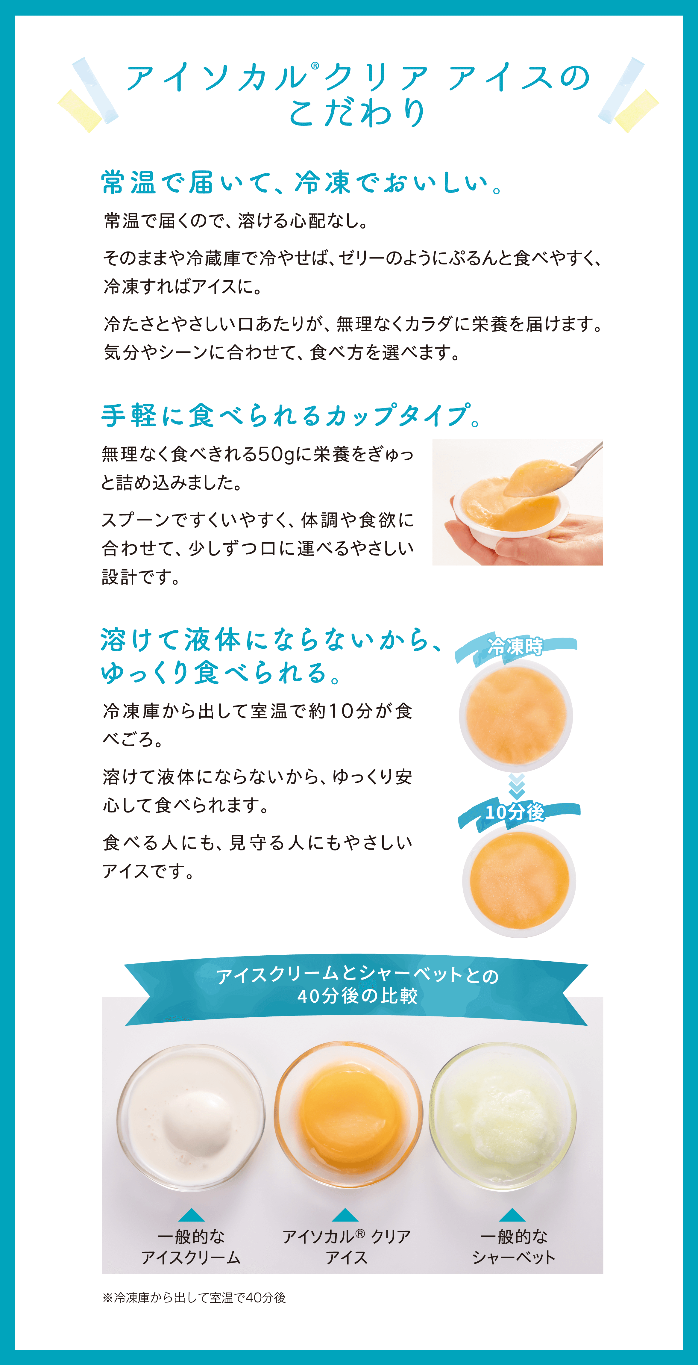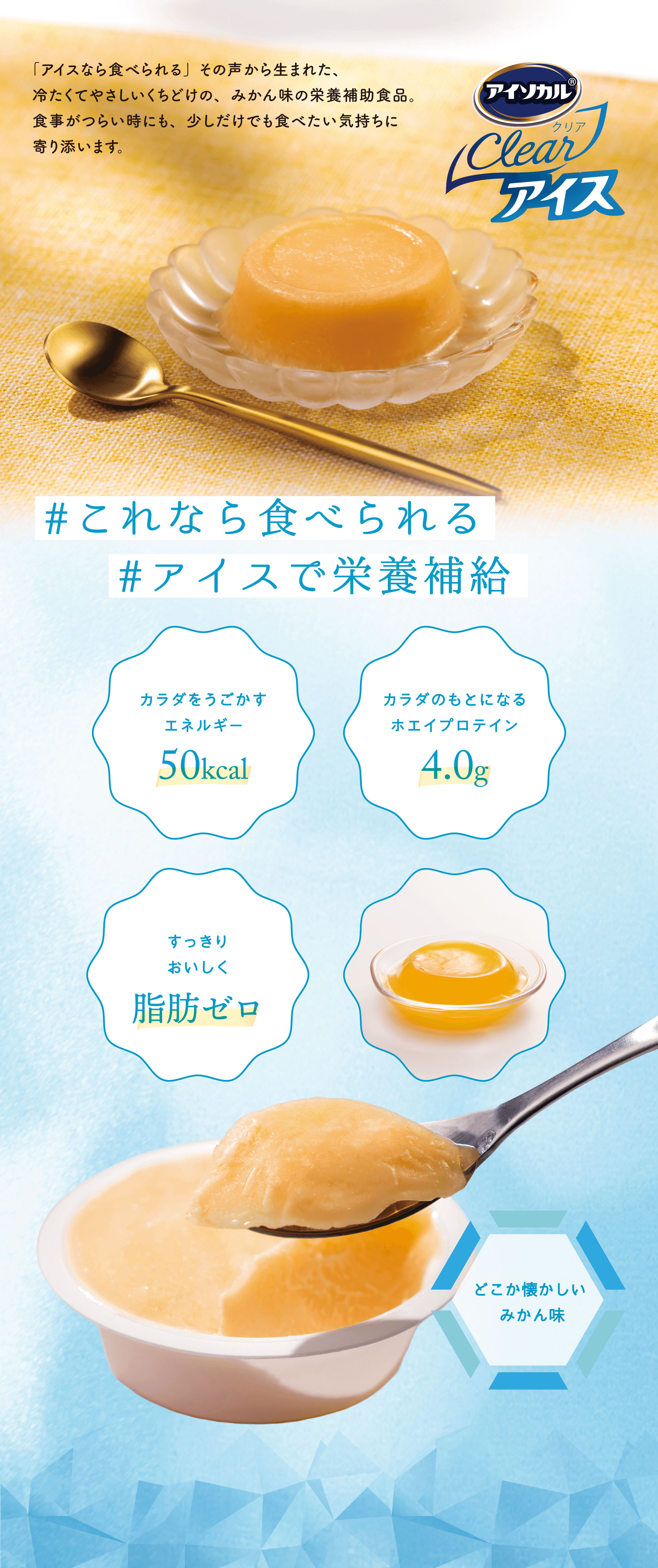 アイソカル® クリア アイス - 2025-10-29 「アイスなら食べられる」その声から生まれた、冷たくてやさしいくちどけの、みかん味の栄養補助食品。 この記事のPDFをダウンロードする この記事のPDFをダウンロードする この記事のPDFをダウンロードする この記事のPDFをダウンロードする Tags 低栄養・食欲低下
